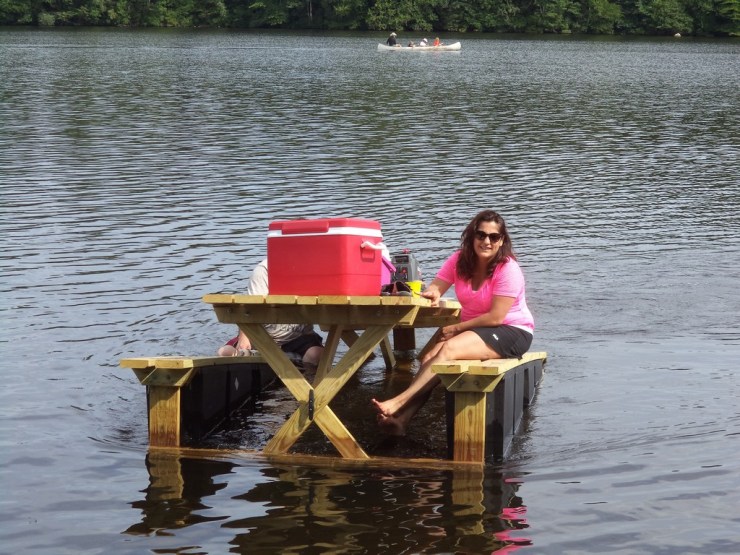 This year was marked by the return of the traditional Sand Dam Reservoir boat parade, led by Rico and Judy Colaluca. They were joined by son Aaron and daughter in law Gina, who piloted a floating picnic table designed and built by Aaron and powered by an antique 2 horsepower outboard motor.