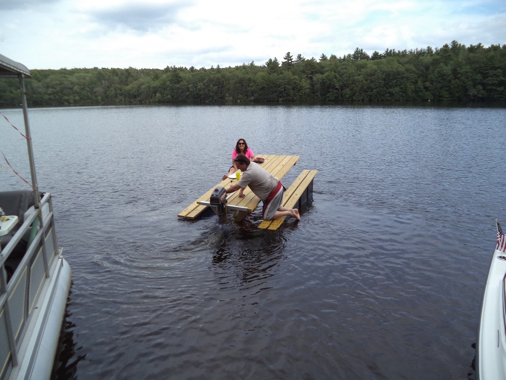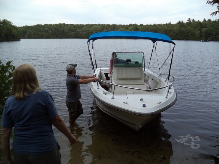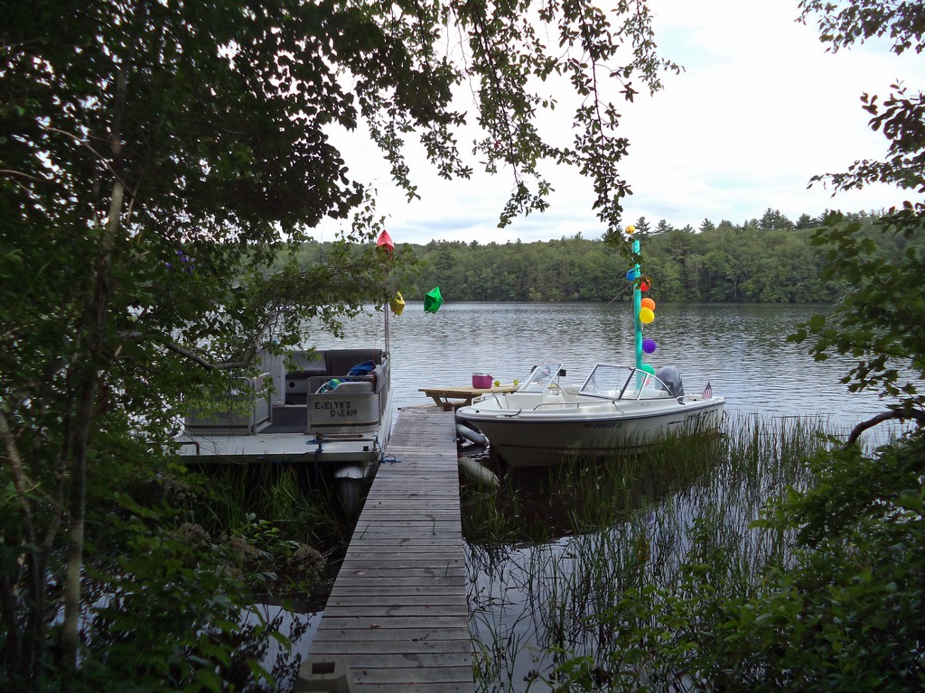 Shortly thereafter, Steve and Cathy Hopkins arrived with their son Scott aboard their pontoon boat called Evelyn’s Dream, named after Steve’s mother and long time lake association member, Evelyn Hopkins. No sooner had they arrived, then Dennis and Marissa Danville pulled up to the beach with their infant son Tre. Next, Ernie and Sharon Heon brought their own pontoon boat with neighbor John Guertin serving as first mate.