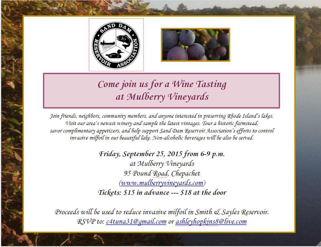 Help support Sand Dam Reservoir Association’s endeavors to reduce invasive weeds on our lake. It will be a fun evening of good appetizers, conversation, and — of course! — wine. Come along and share in the fun, just as the foliage begins to turn. Check out Mulberry Vineyards at their website here.