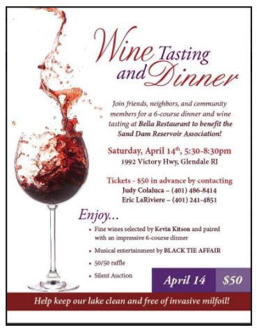 Kevin Kitson of Chepachet Village Wine and Spirits will again provide his guidance and expertise as we sample a variety of wines, which will be matched course-by-course with dishes specially designed for the event by the chefs at Bella’s. (Vegetarian options are available, too — just notify the person who sold you the tickets.) Entertainment from Black Tie Affair, which was such a big hit last year, is sure to make the evening memorable. This year’s Silent Auction led by our Board Member, Marissa Danville, has many desirable baskets and gift cards already (please feel free to offer a donation, as we can certainly fit in more items.) An ever-popular 50-50 raffle is another way that our fundraising team is working to do everything we can to provide fundraising options to SDRA in our fight to mitigate invasive species on Smith & Sayles Reservoir.