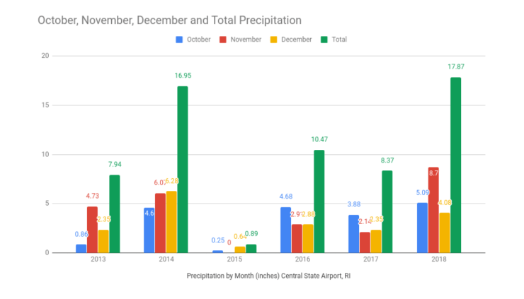 | Precipitation by Month (inches) Central State Airport, RI | ||||
