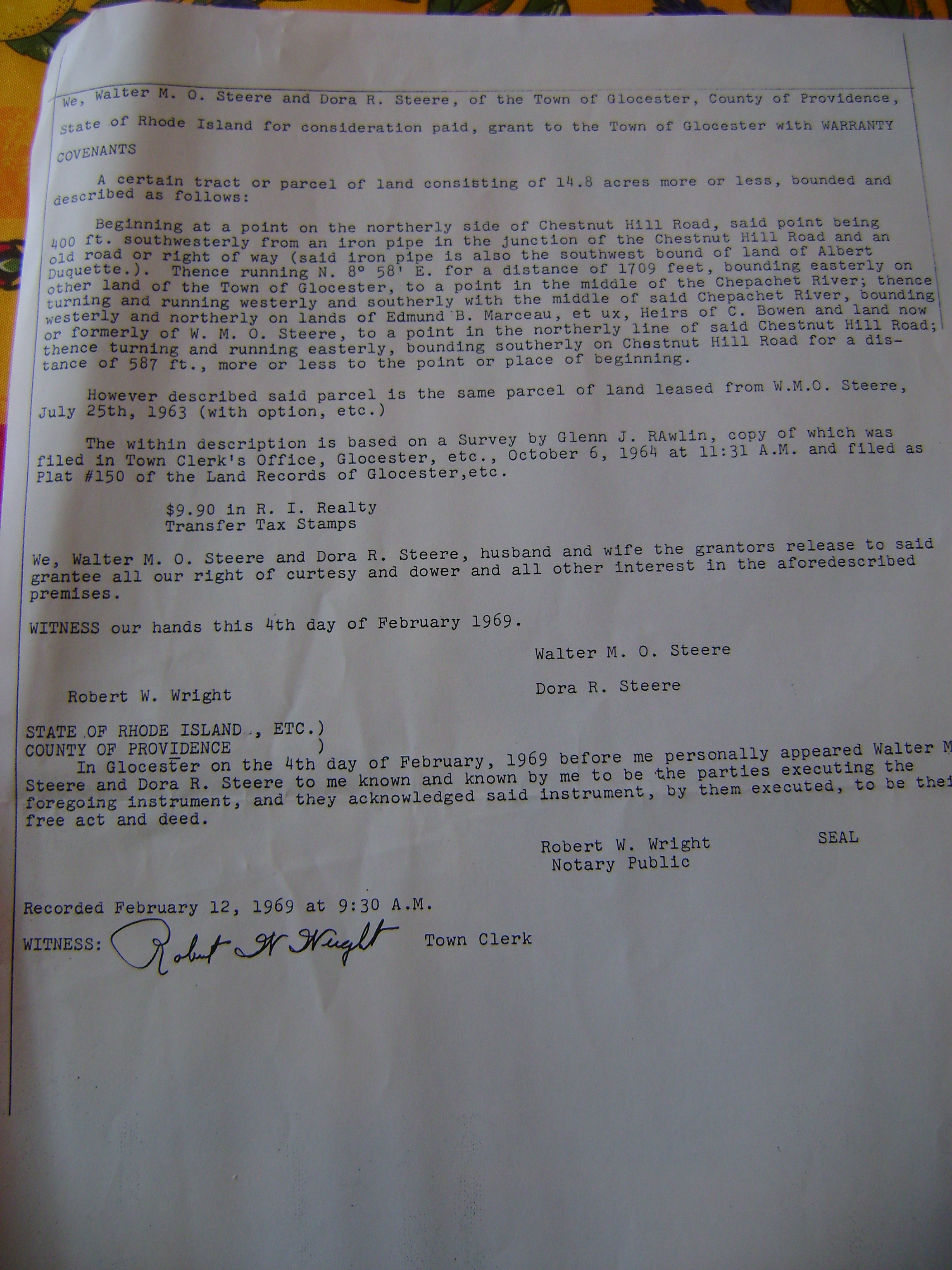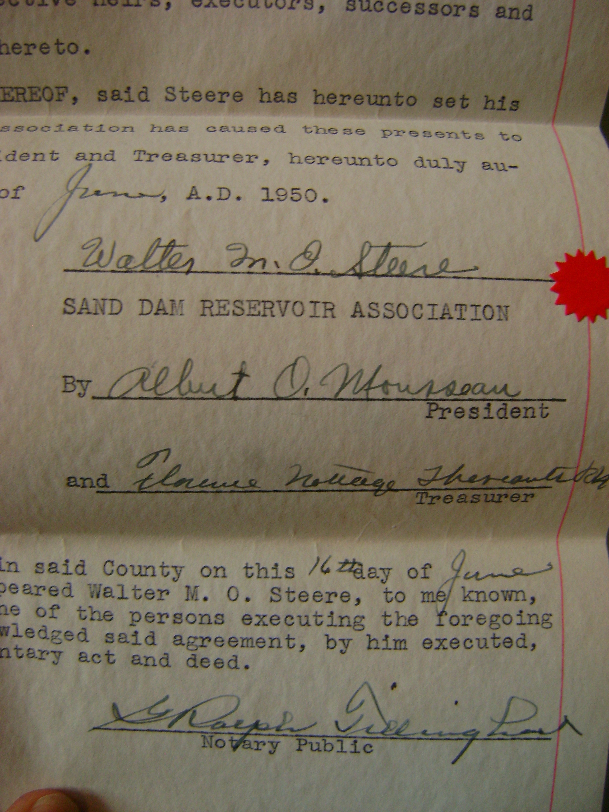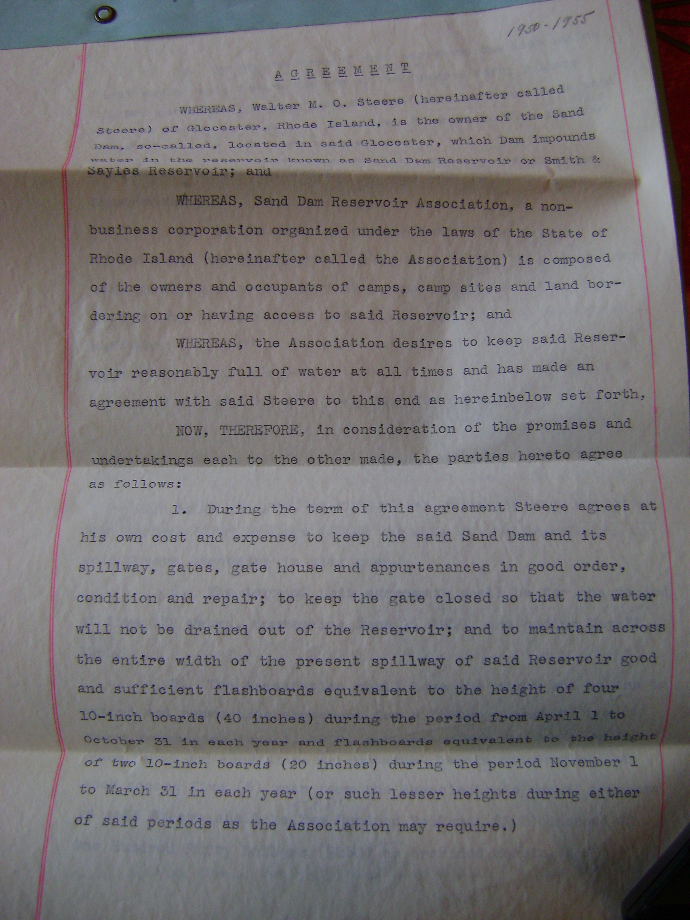 Rhode Island Laws Relating to Regulations of Boats, Department of Natural ResourcesTown of Glocester, Rhode Island Tax Books from 1930 and 1937“A certain tract of land consisting of 14.8 acres….”Agreement between Walter Steere and the Sand Dam Reservoir AssociationMap: Irving Hawkins Farm. Located on the west side of Chopmist Hill Road in the town of Glocester, Rhode Island, 1938. Willard B. Hall, Surveyor.The signatures of the first officers, 1950.Aerial photograph of the lake, taken 05-16-1950.1987 letter to Bob Huckins indicating the committment of the State of Rhode Island and Providence Plantations to the dispersal of $180,000 for protection of lands.A Woonsocket Call newspaper article describes the expected transfer of the Scott-Worthington property to the Glocester Land Trust, dated 9-30-1987. This property is on Sand Dam Reservoir, near the dam and heading southward.