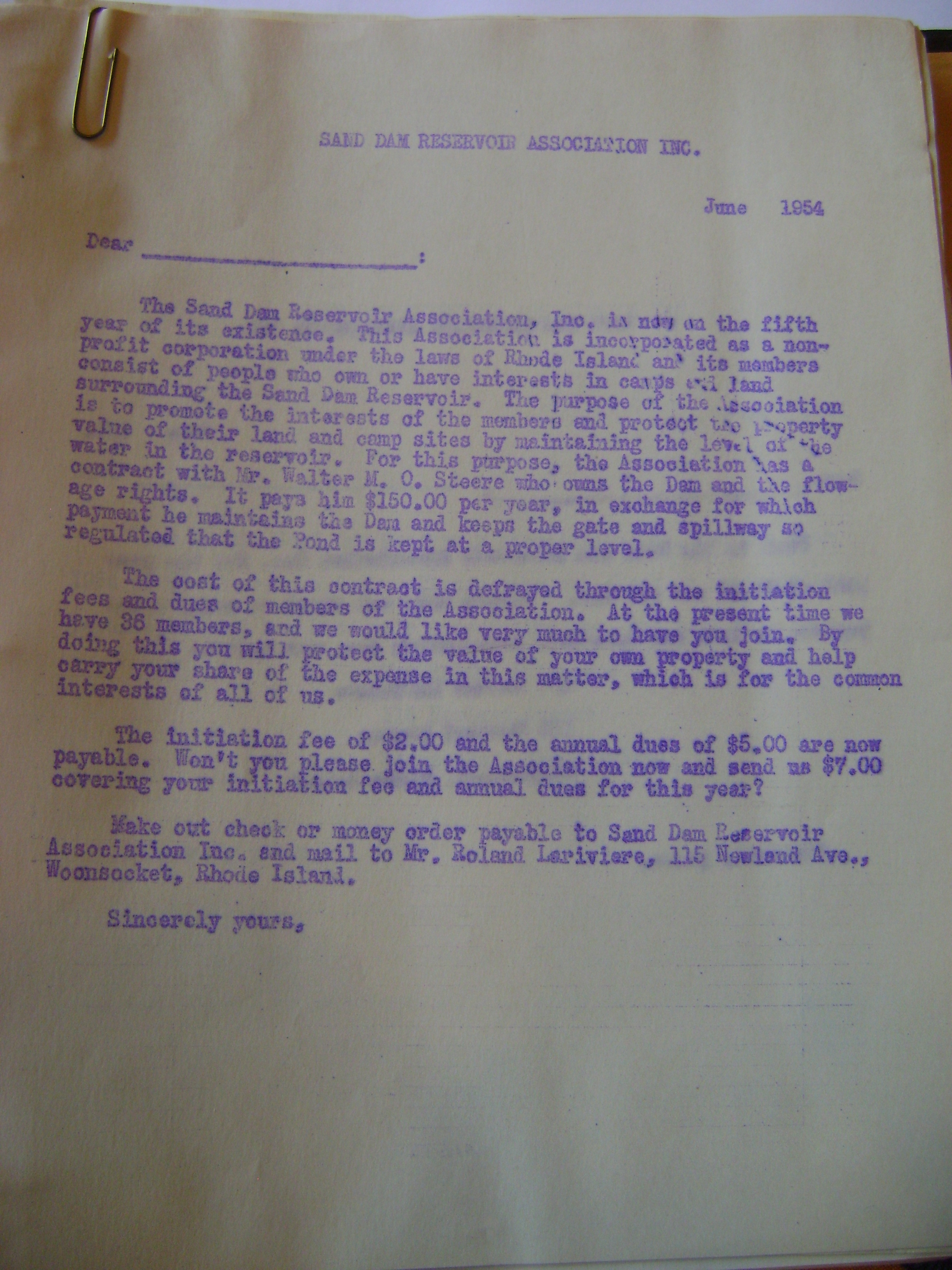 Mimeographed by-laws, dated 1954 and reading “the Sand Dam Reservoir, Inc. is now in the fifth year of its existence…”
