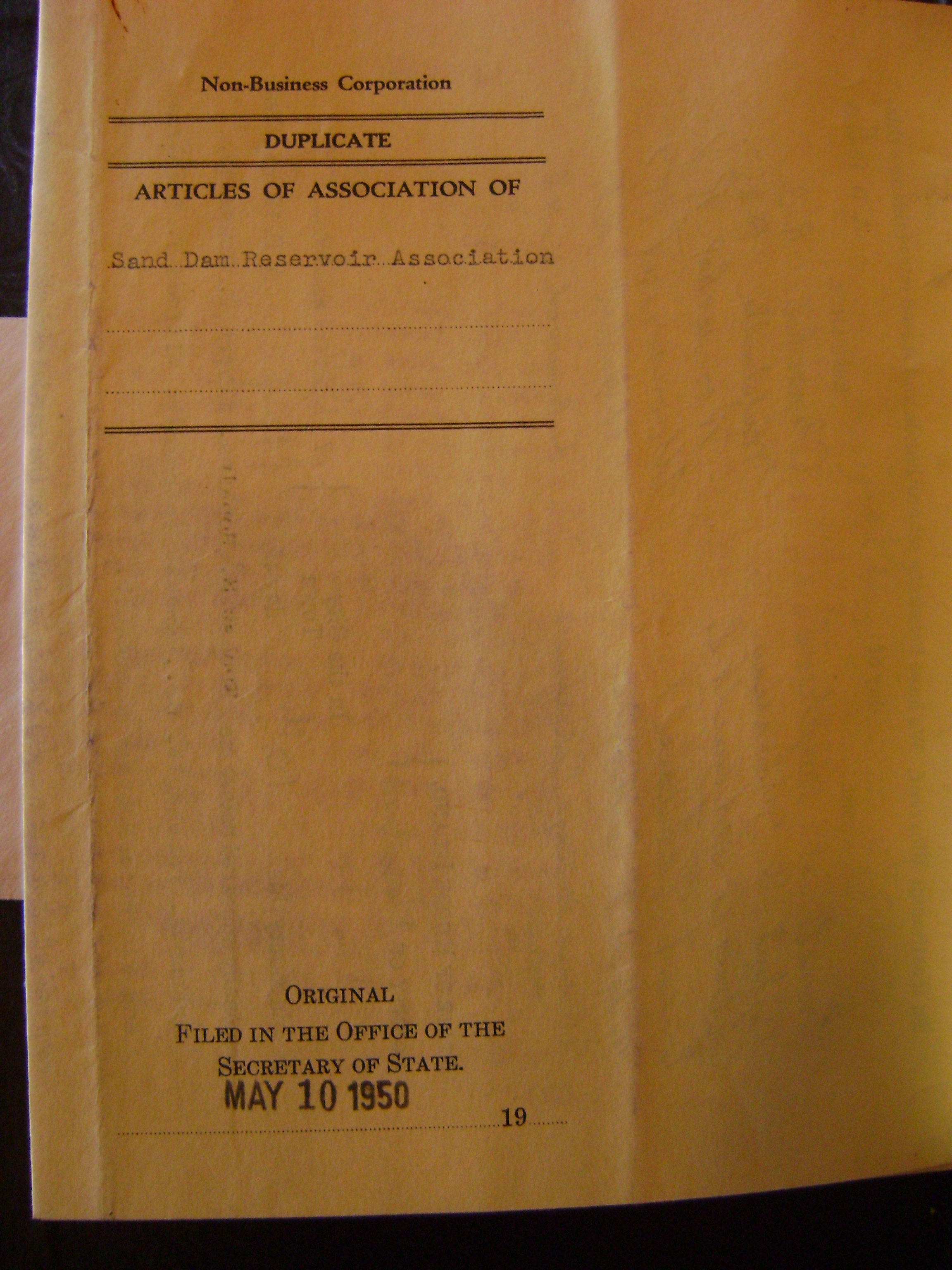 acknowledgement from the State of Rhode Island and Providence Plantations, Secretary of State, that Ernest S. Hopkins, Albert O. Mousseau, Arthur A. Tetrault, Wilfred J. Duchame, and Florence Nottage Therault filed on May 10, 1950 articles of association for forming a corporation in the name of Sand Dam Reservoir Association