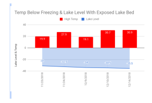 Winter 2018-2019 was the year of the un-drawdown. There was simply too much precipitation to lower the water level beyond 47 inches lower than capacity. There were five days when the high temperature was at freezing or below and the lakebed exposed, but the lowest level was a mere 35 inches below capacity. See the included chart. The lake is currently refilling. The drawdown remains part of our lake management strategy and we intent to continue the practice next year.